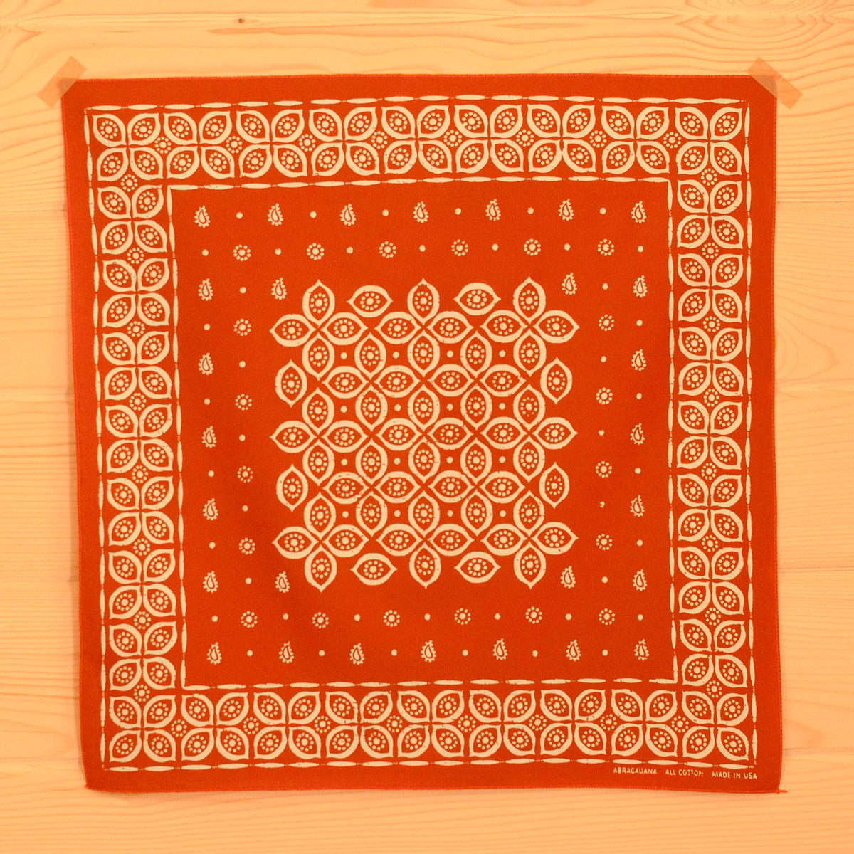 Burnt orange bandana with a white geometric pattern composed of squares. Folded into quarters. By Abracadana